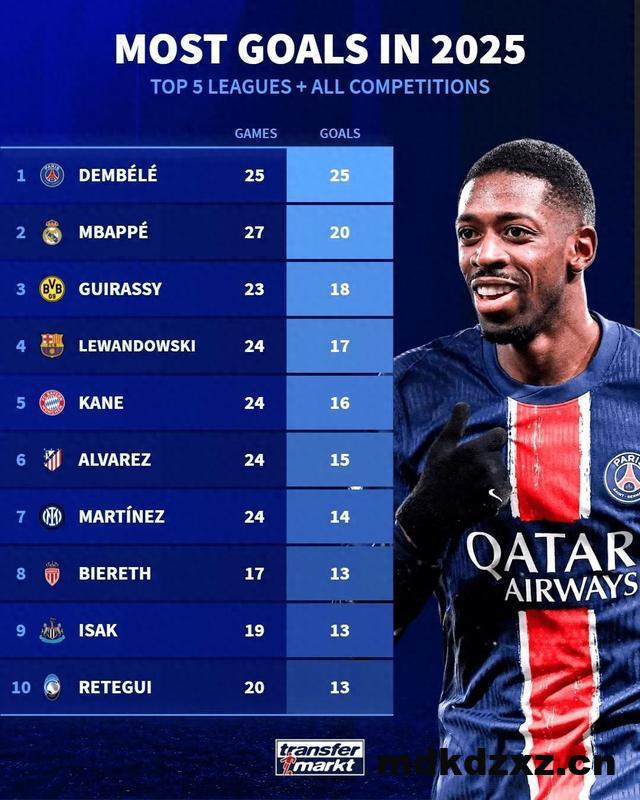 直播吧5月1日讯 德转列出2025年五大联赛球员射手榜,登贝莱各项赛事25场比赛打进25球居首,姆巴佩第二,莱万、凯恩前五。