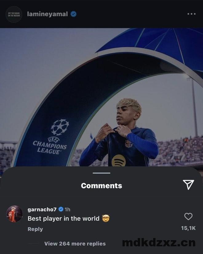 曼联球员加纳乔在评论区留言:“世界最佳”。
