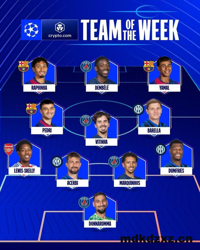 欧冠官方公布了本周最佳阵容,登贝莱、亚马尔、拉菲尼亚领衔。