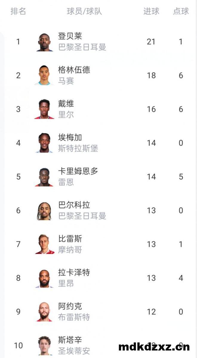 附:法甲目前的射手榜情况(注:扣掉这一球后,格林伍德的进球数仍为18个):