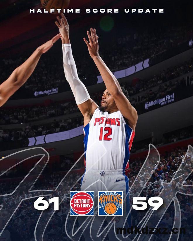 活塞队的比斯利上半场得到18分,坎宁安得到11分,哈里斯得到10分;尼克斯队的布伦森得到20分,阿奴诺比得到13分,布里奇斯得到12分。