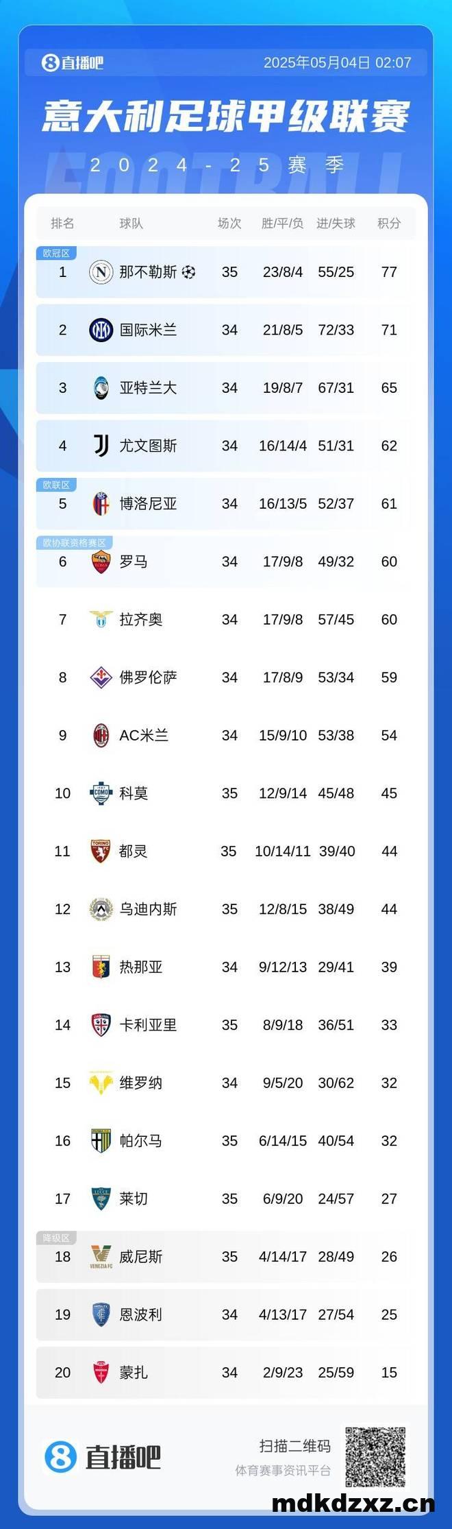 意甲积分榜:那不勒斯联赛4连胜,先赛1场领先国米6分