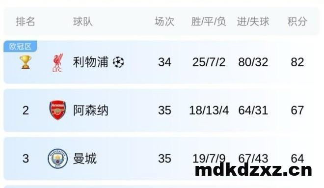 在最新的积分榜上,曼城积64分排名第3,仅落后排名第2的阿森纳3分。