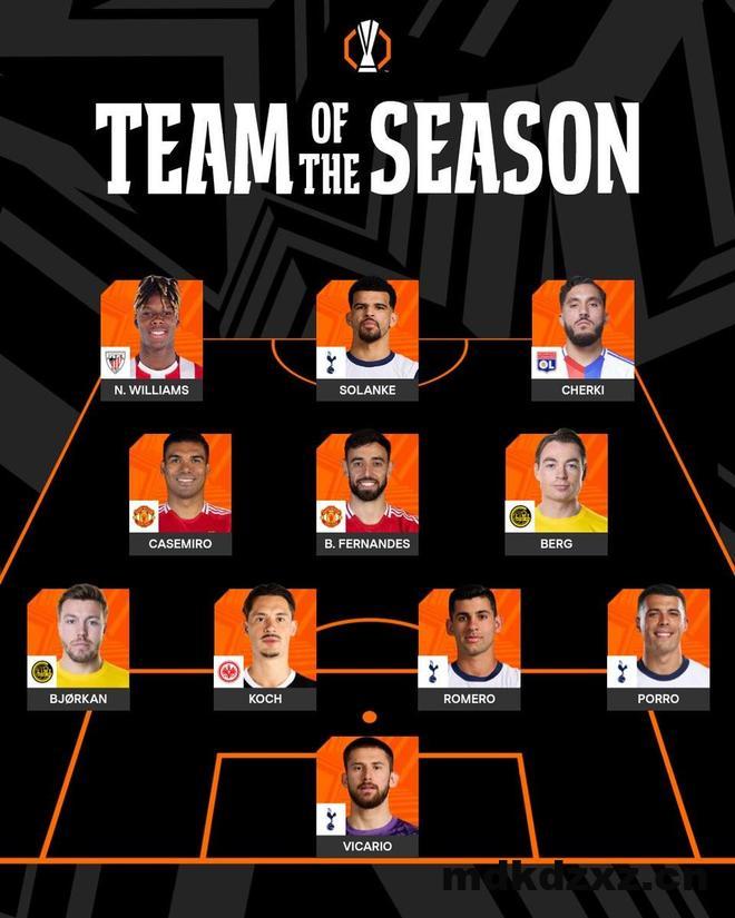 2024-25赛季欧联杯落幕,欧联杯官方公布了本赛季最佳阵容,热刺4人入选,布鲁诺-费尔南德斯、卡塞米罗在列。