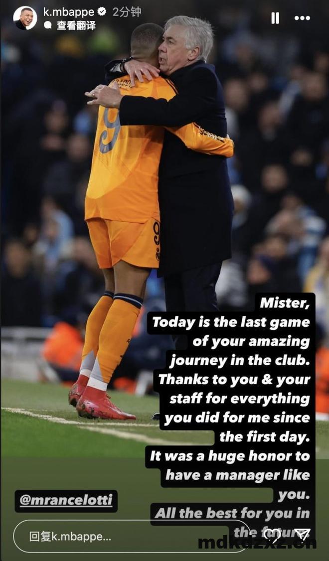 姆巴佩更新社交媒体晒照发文告别安切洛蒂。