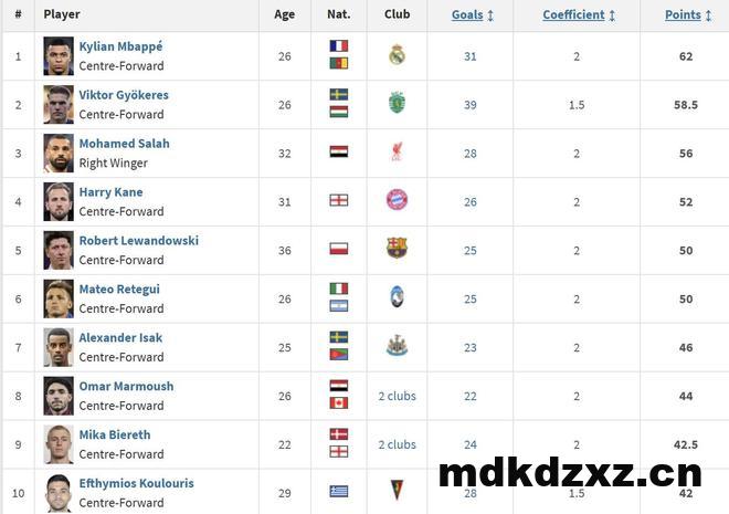 24-25赛季欧洲金靴奖排名前10